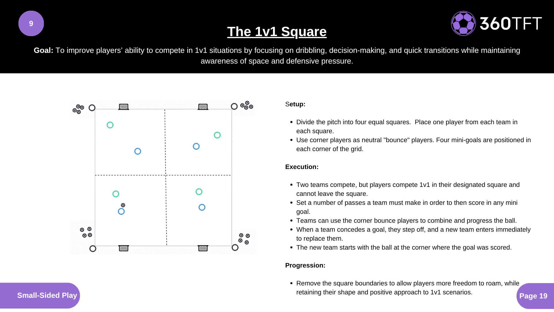 Setup: • Divide the pitch into four equal squares. Place one player from each team in each square. • Use corner players as neutral "bounce" players. Four mini-goals are positioned in each corner of the grid. Execution: • Two teams compete, but players compete 1v1 in their designated square and cannot leave the square. • Set a number of passes a team must make in order to then score in any mini goal. • Teams can use the corner bounce players to combine and progress the ball. • When a team concedes a goal, they step off, and a new team enters immediately to replace them. • The new team starts with the ball at the corner where the goal was scored. Progression: • Remove the square boundaries to allow players more freedom to roam, while retaining their shape and positive approach to 1v1 scenarios.