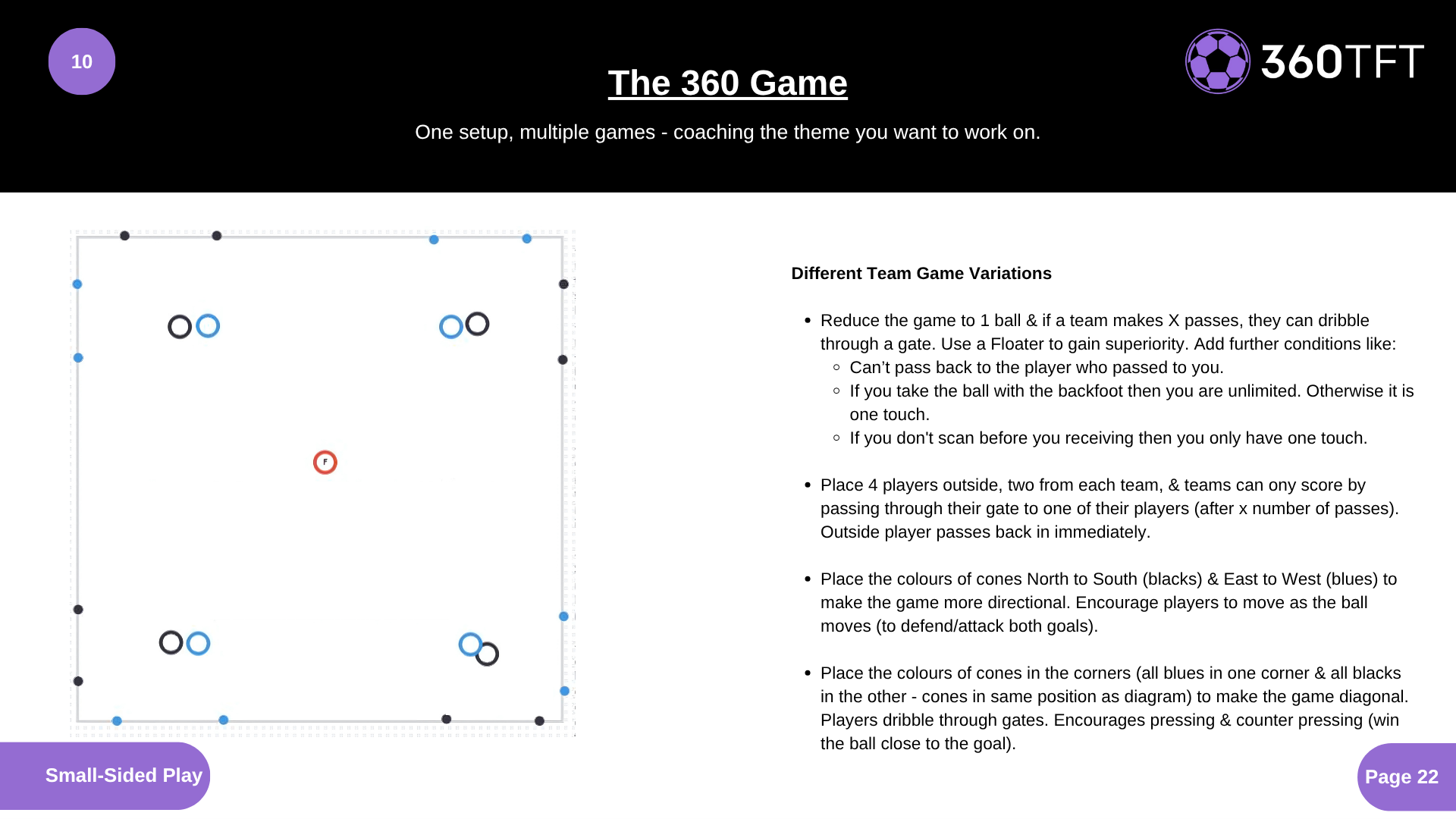 Different Team Game Variations • Reduce the game to 1 ball & if a team makes X passes, they can dribble through a gate. Use a Floater to gain superiority. Add further conditions like: ◦ Can’t pass back to the player who passed to you. ◦ If you take the ball with the backfoot then you are unlimited. Otherwise it is one touch. ◦ If you don't scan before receiving then you only have one touch. • Place 4 players outside, two from each team, & teams can only score by passing through their gate to one of their players (after x number of passes). Outside player passes back in immediately. • Place the colours of cones North to South (blacks) & East to West (blues) to make the game more directional. Encourage players to move as the ball moves (to defend/attack both goals). • Place the colours of cones in the corners (all blues in one corner & all blacks in the other - cones in same position as diagram) to make the game diagonal. Players dribble through gates. Encourages pressing & counter pressing (win the ball close to the goal).