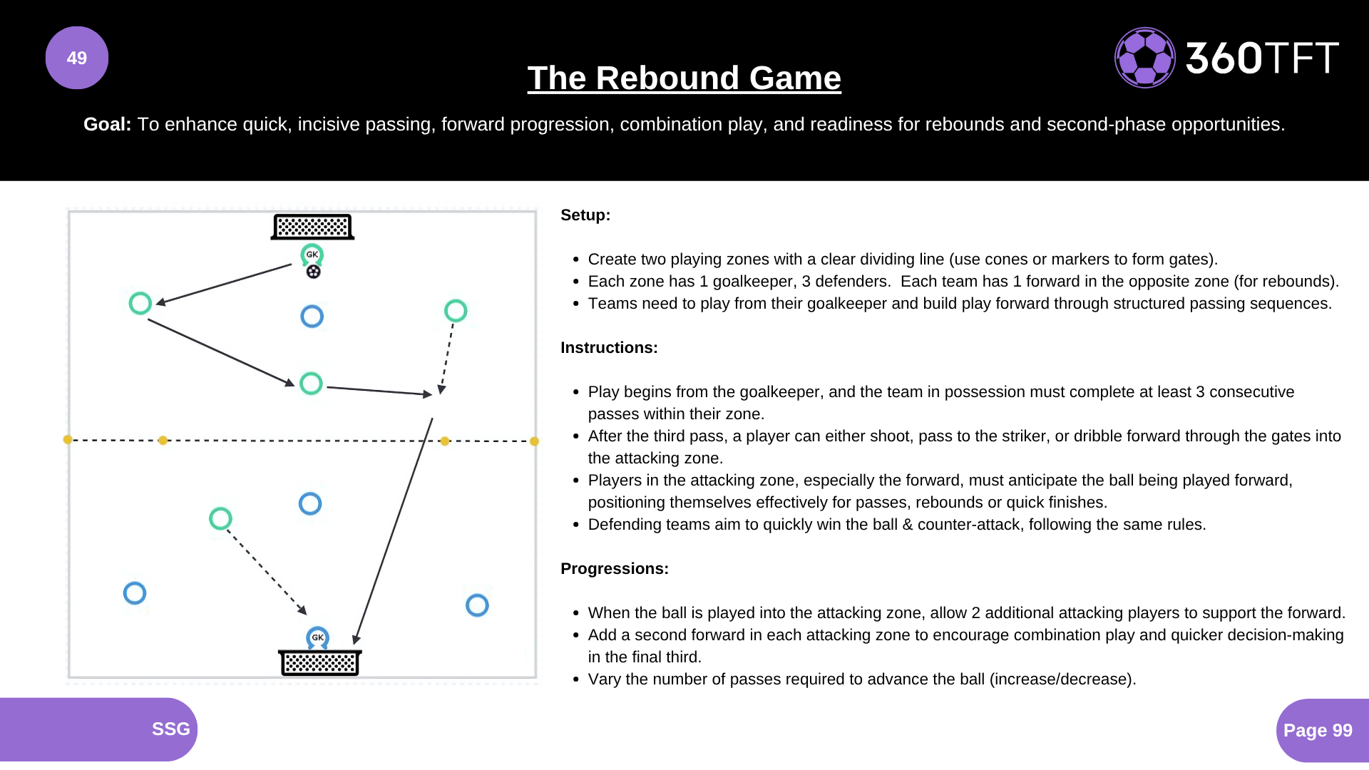 • Play begins from the goalkeeper, and the team in possession must complete at least 3 consecutive passes within their zone. • After the third pass, a player can either shoot, pass to the striker, or dribble forward through the gates into the attacking zone. • Players in the attacking zone, especially the forward, must anticipate the ball being played forward, positioning themselves effectively for passes, rebounds or quick finishes. • Defending teams aim to quickly win the ball & counter-attack, following the same rules.