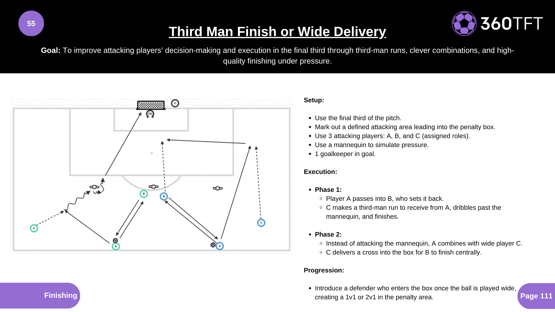To improve attacking players’ decision-making and execution in the final third through third-man runs, clever combinations, and high-quality finishing under pressure.