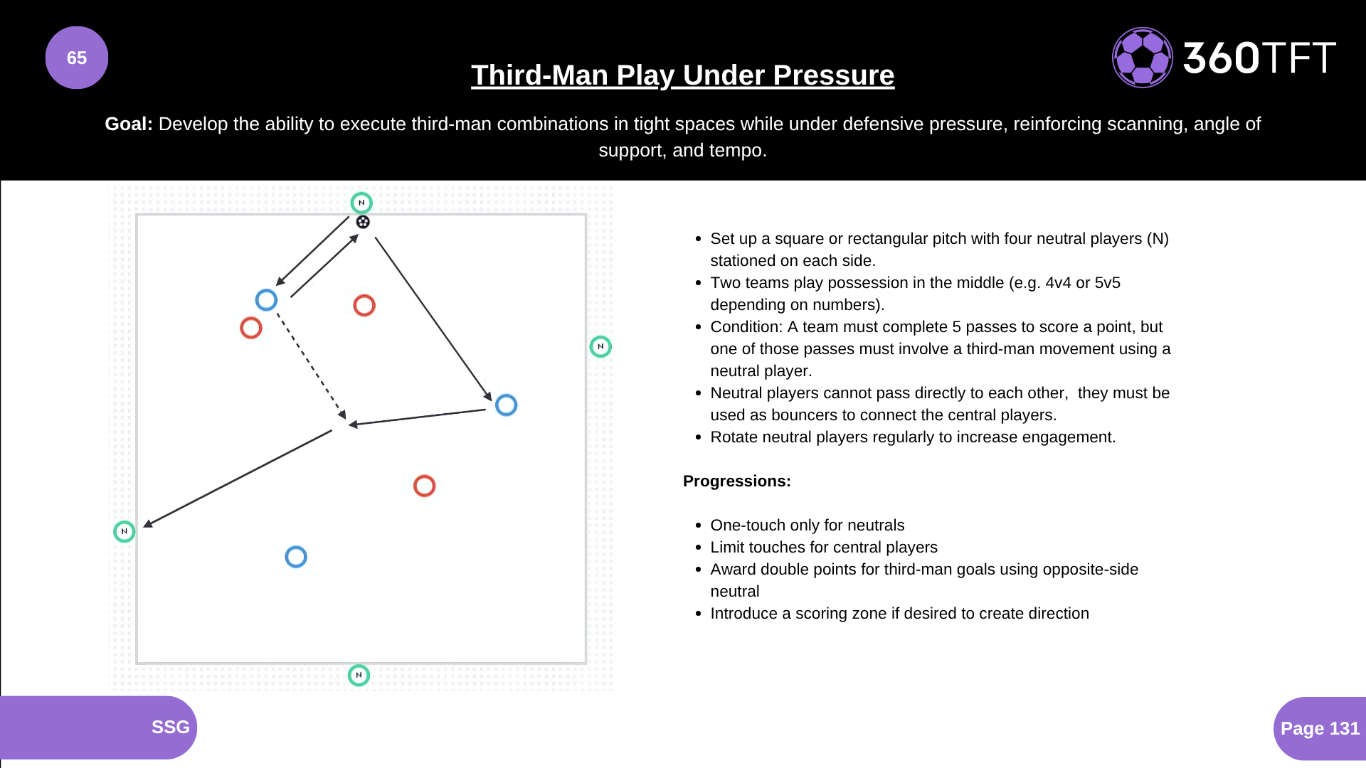 • Set up a square or rectangular pitch with four neutral players (N) stationed on each side. • Two teams play possession in the middle (e.g. 4v4 or 5v5 depending on numbers). • Condition: A team must complete 5 passes to score a point, but one of those passes must involve a third-man movement using a neutral player. • Neutral players cannot pass directly to each other, they must be used as bouncers to connect the central players. • Rotate neutral players regularly to increase engagement.
