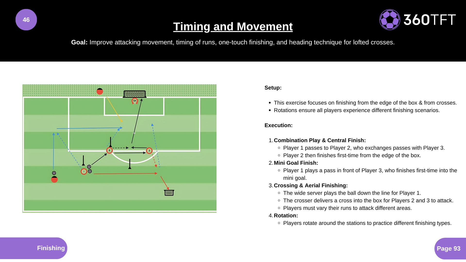 Setup: • This exercise focuses on finishing from the edge of the box & from crosses. • Rotations ensure all players experience different finishing scenarios. Execution: 1. Combination Play & Central Finish: ◦ Player 1 passes to Player 2, who exchanges passes with Player 3. ◦ Player 2 then finishes first-time from the edge of the box. 2. Mini Goal Finish: ◦ Player 1 plays a pass in front of Player 3, who finishes first-time into the mini goal. 3. Crossing & Aerial Finishing: ◦ The wide server plays the ball down the line for Player 1. ◦ The crosser delivers a cross into the box for Players 2 and 3 to attack. ◦ Players must vary their runs to attack different areas. 4. Rotation: ◦ Players rotate around the stations to practice different finishing types.