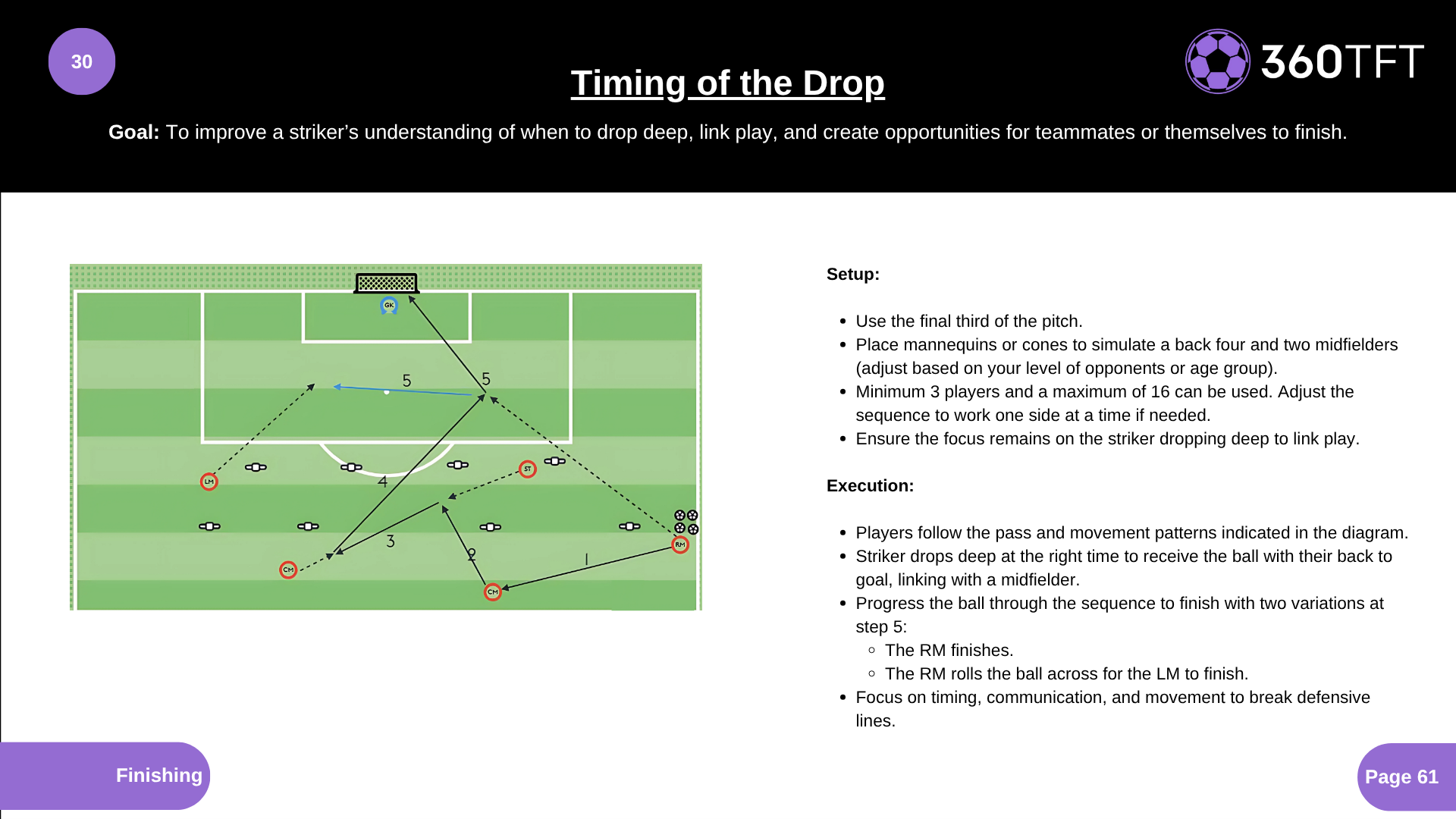 To improve a striker’s understanding of when to drop deep, link play, and create opportunities for teammates or themselves to finish.