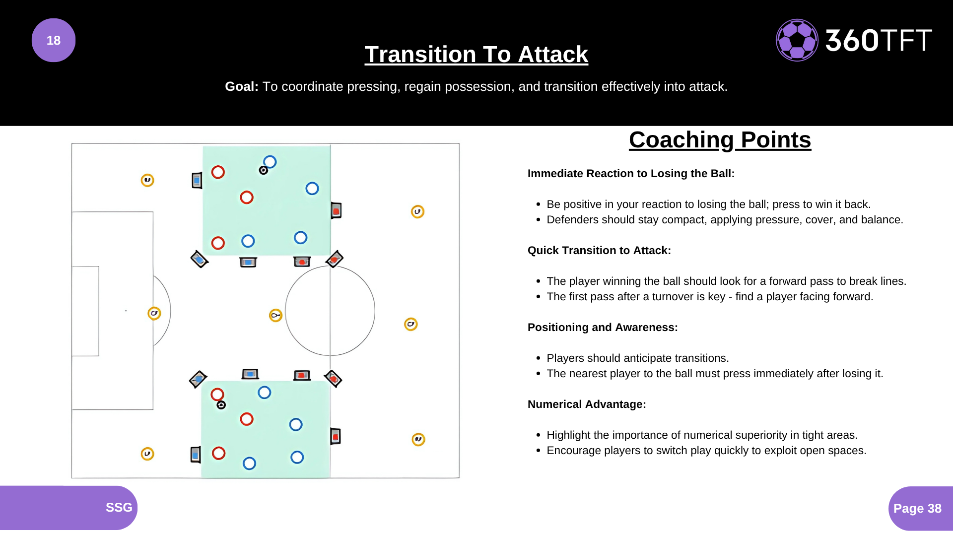 Immediate Reaction to Losing the Ball: • Be positive in your reaction to losing the ball; press to win it back. • Defenders should stay compact, applying pressure, cover, and balance. Quick Transition to Attack: • The player winning the ball should look for a forward pass to break lines. • The first pass after a turnover is key - find a player facing forward. Positioning and Awareness: • Players should anticipate transitions. • The nearest player to the ball must press immediately after losing it. Numerical Advantage: • Highlight the importance of numerical superiority in tight areas. • Encourage players to switch play quickly to exploit open spaces.