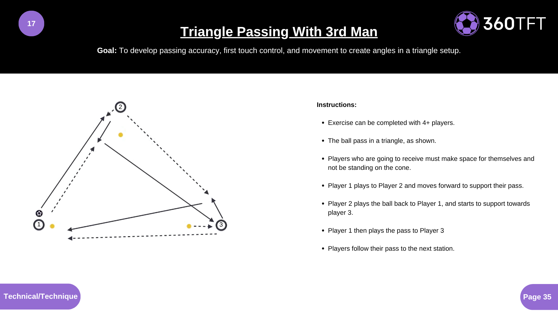 • Exercise can be completed with 4+ players. • The ball pass in a triangle, as shown. • Players who are going to receive must make space for themselves and not be standing on the cone. • Player 1 plays to Player 2 and moves forward to support their pass. • Player 2 plays the ball back to Player 1, and starts to support towards player 3. • Player 1 then plays the pass to Player 3. • Players follow their pass to the next station.