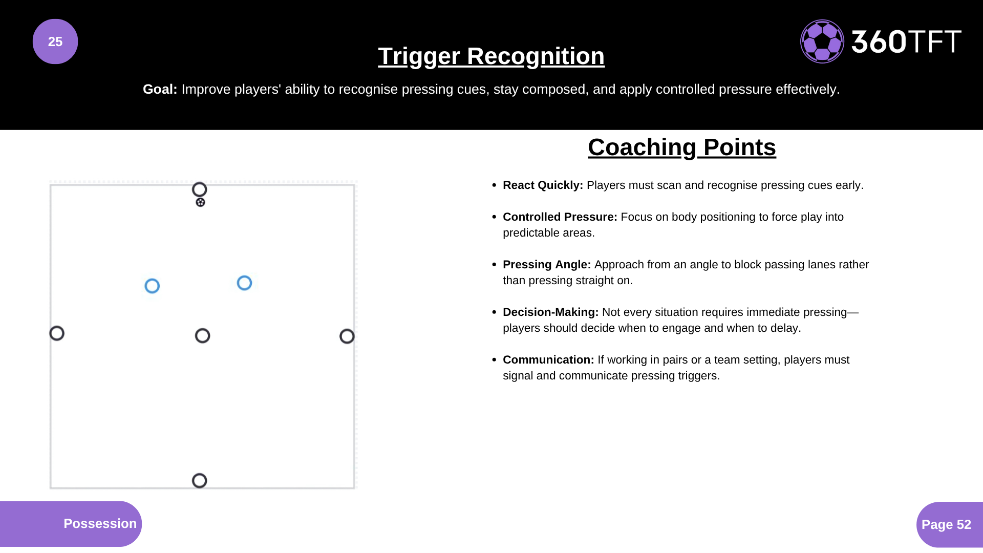 • React Quickly: Players must scan and recognise pressing cues early. • Controlled Pressure: Focus on body positioning to force play into predictable areas. • Pressing Angle: Approach from an angle to block passing lanes rather than pressing straight on. • Decision-Making: Not every situation requires immediate pressing—players should decide when to engage and when to delay. • Communication: If working in pairs or a team setting, players must signal and communicate pressing triggers.