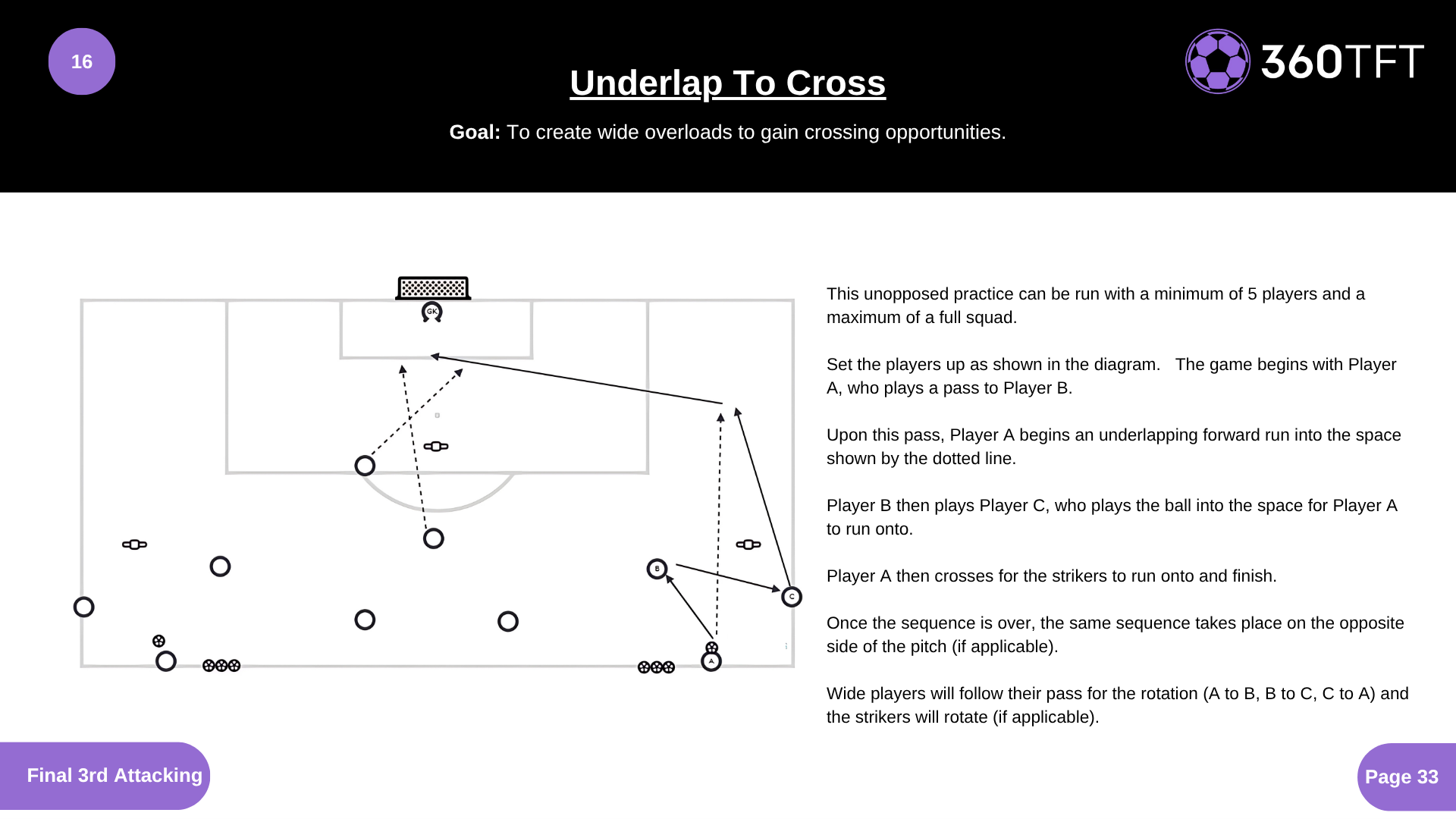 This unopposed practice can be run with a minimum of 5 players and a maximum of a full squad. Set the players up as shown in the diagram. The game begins with Player A, who plays a pass to Player B. Upon this pass, Player A begins an underlapping forward run into the space shown by the dotted line. Player B then plays Player C, who plays the ball into the space for Player A to run onto. Player A then crosses for the strikers to run onto and finish. Once the sequence is over, the same sequence takes place on the opposite side of the pitch (if applicable). Wide players will follow their pass for the rotation (A to B, B to C, C to A) and the strikers will rotate (if applicable).