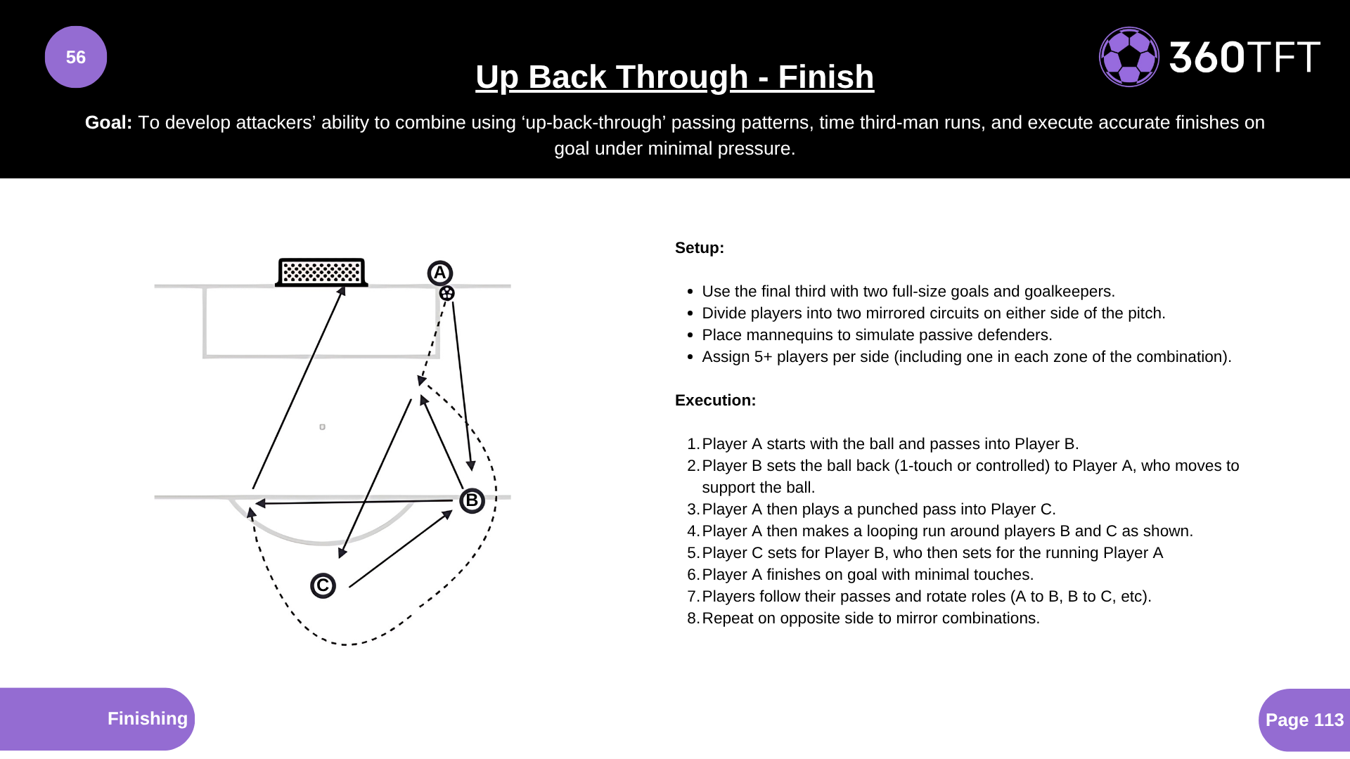 • Use the final third with two full-size goals and goalkeepers. • Divide players into two mirrored circuits on either side of the pitch. • Place mannequins to simulate passive defenders. • Assign 5+ players per side (including one in each zone of the combination). • Player A starts with the ball and passes into Player B. • Player B sets the ball back (1-touch or controlled) to Player A, who moves to support the ball. • Player A then plays a punched pass into Player C. • Player A then makes a looping run around players B and C as shown. • Player C sets for Player B, who then sets for the running Player A. • Player A finishes on goal with minimal touches. • Players follow their passes and rotate roles (A to B, B to C, etc). • Repeat on opposite side to mirror combinations.