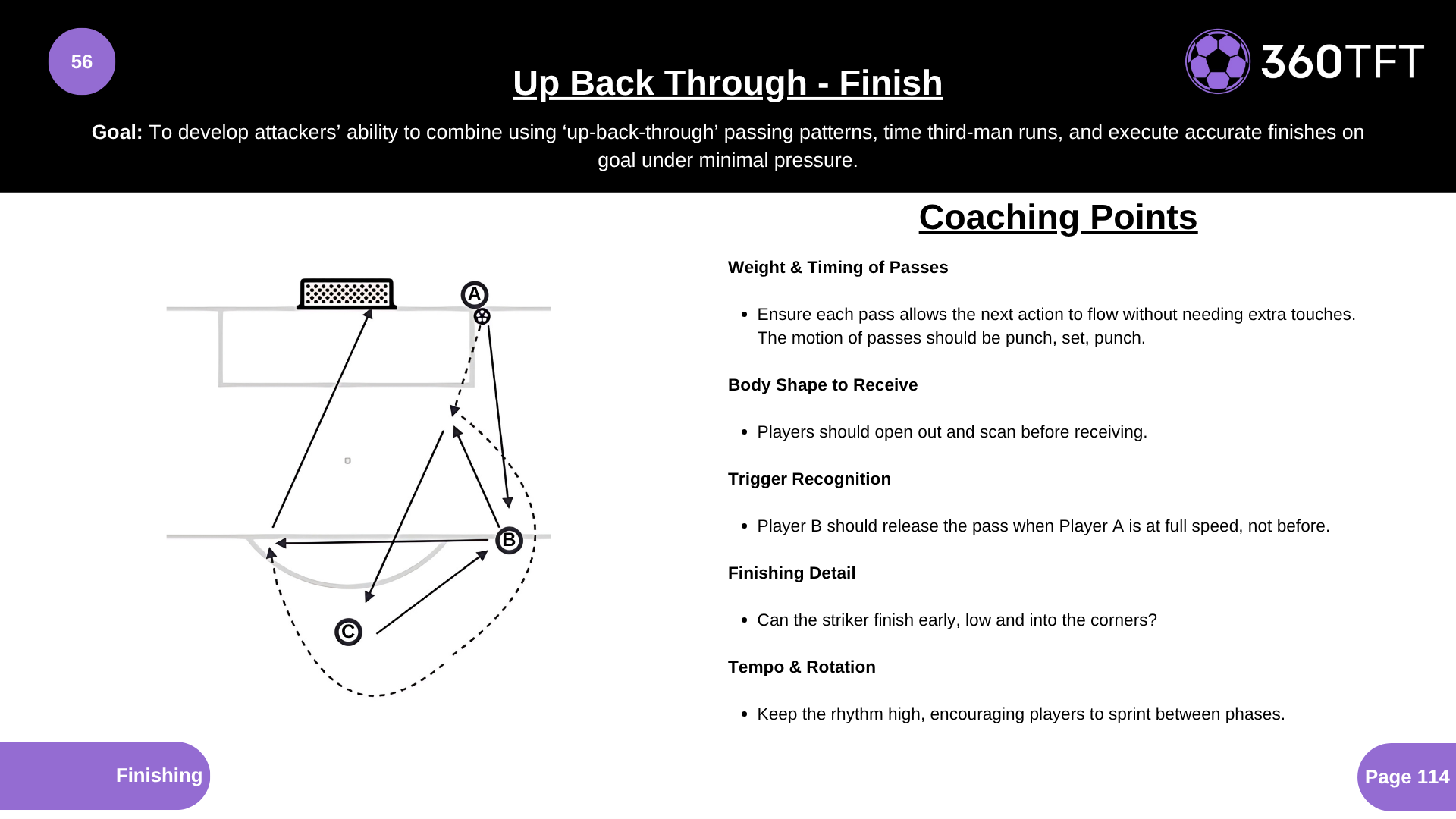 Weight & Timing of Passes • Ensure each pass allows the next action to flow without needing extra touches. The motion of passes should be punch, set, punch. Body Shape to Receive • Players should open out and scan before receiving. Trigger Recognition • Player B should release the pass when Player A is at full speed, not before. Finishing Detail • Can the striker finish early, low and into the corners? Tempo & Rotation • Keep the rhythm high, encouraging players to sprint between phases.
