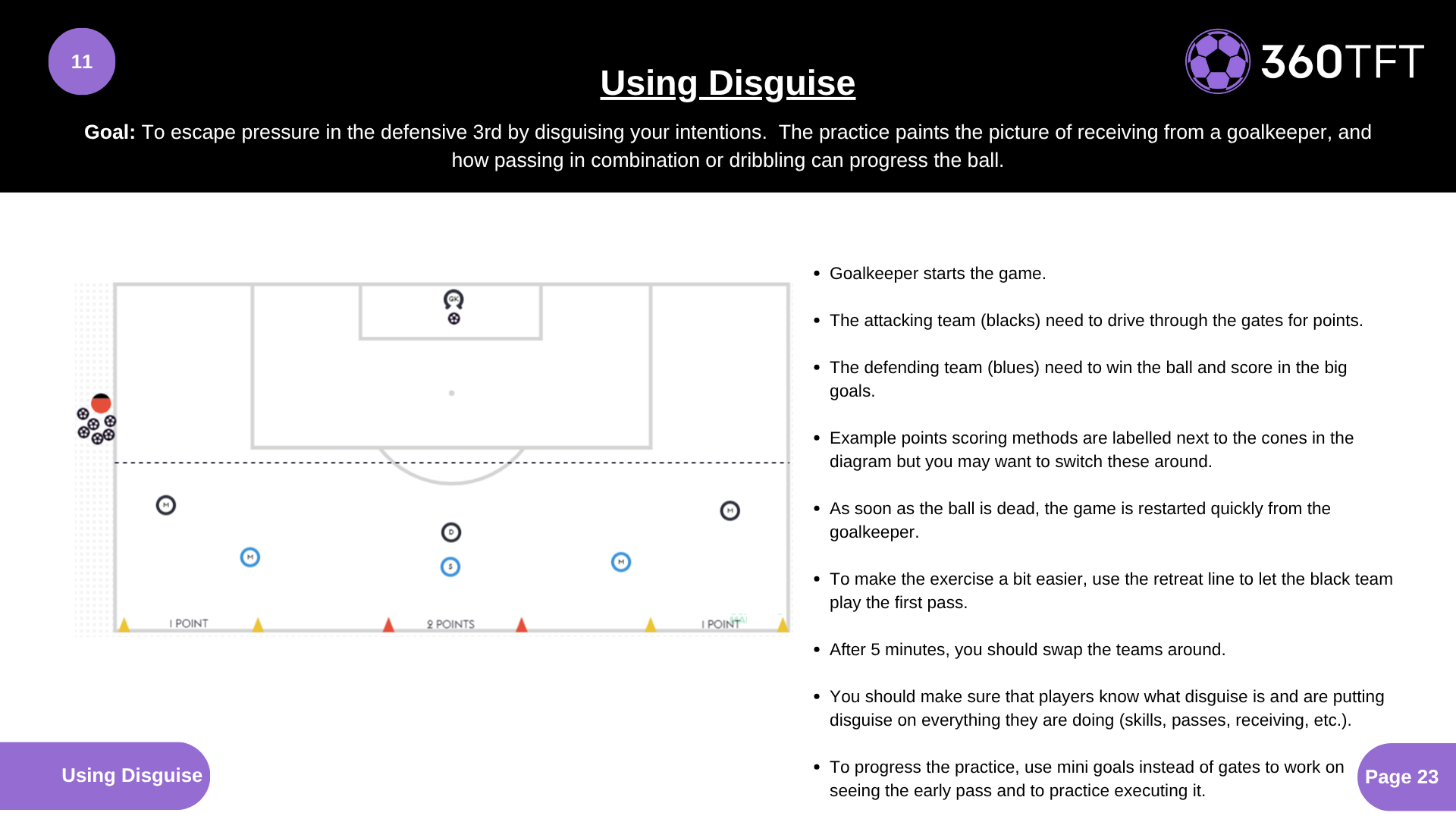 • Goalkeeper starts the game. • The attacking team (blacks) need to drive through the gates for points. • The defending team (blues) need to win the ball and score in the big goals. • Example points scoring methods are labelled next to the cones in the diagram but you may want to switch these around. • As soon as the ball is dead, the game is restarted quickly from the goalkeeper. • To make the exercise a bit easier, use the retreat line to let the black team play the first pass. • After 5 minutes, you should swap the teams around. • You should make sure that players know what disguise is and are putting disguise on everything they are doing (skills, passes, receiving, etc.). • To progress the practice, use mini goals instead of gates to work on seeing the early pass and to practice executing it.