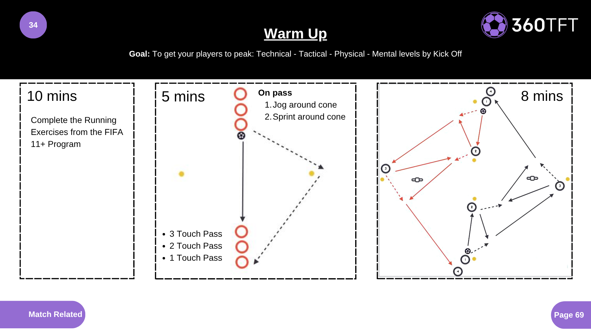 • Complete the Running Exercises from the FIFA 11+ Program • On pass • 1. Jog around cone • 2. Sprint around cone • 3 Touch Pass • 2 Touch Pass • 1 Touch Pass
