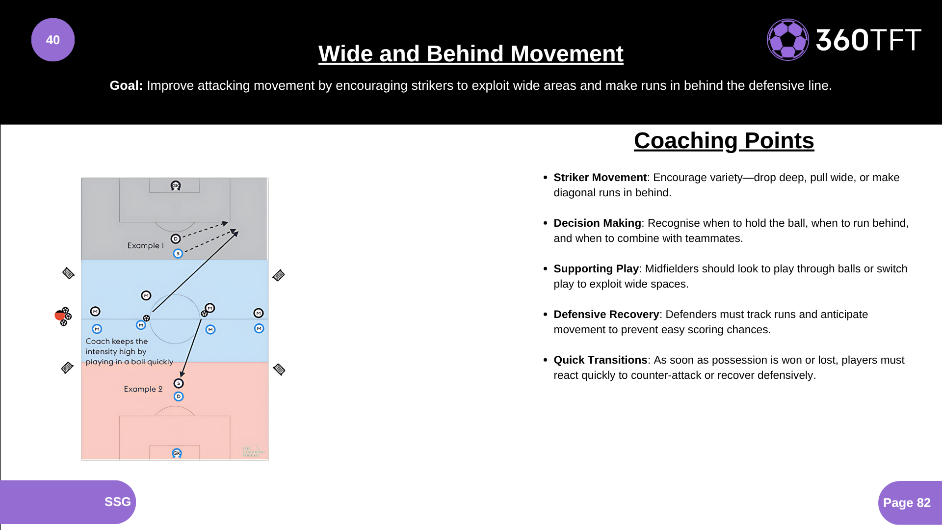 • Striker Movement: Encourage variety—drop deep, pull wide, or make diagonal runs in behind. • Decision Making: Recognise when to hold the ball, when to run behind, and when to combine with teammates. • Supporting Play: Midfielders should look to play through balls or switch play to exploit wide spaces. • Defensive Recovery: Defenders must track runs and anticipate movement to prevent easy scoring chances. • Quick Transitions: As soon as possession is won or lost, players must react quickly to counter-attack or recover defensively.